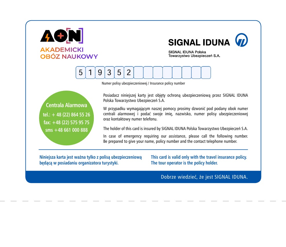 Zalecamy Uczestnikom Obozu zawarcie ubezpieczenia od kosztów rezygnacji z imprezy u dowolnego ubezpieczyciela lub za naszą rekomendacją w Signal Iduna Polska Towarzystwo Ubezpieczeń S.A. za pomocą formularza internetowego dostępnego tutaj. Szczegóły dot. tego ubezpieczenia znajdują się w pliku Ogólne warunki ubezpieczenia kosztów imprezy turystycznej.